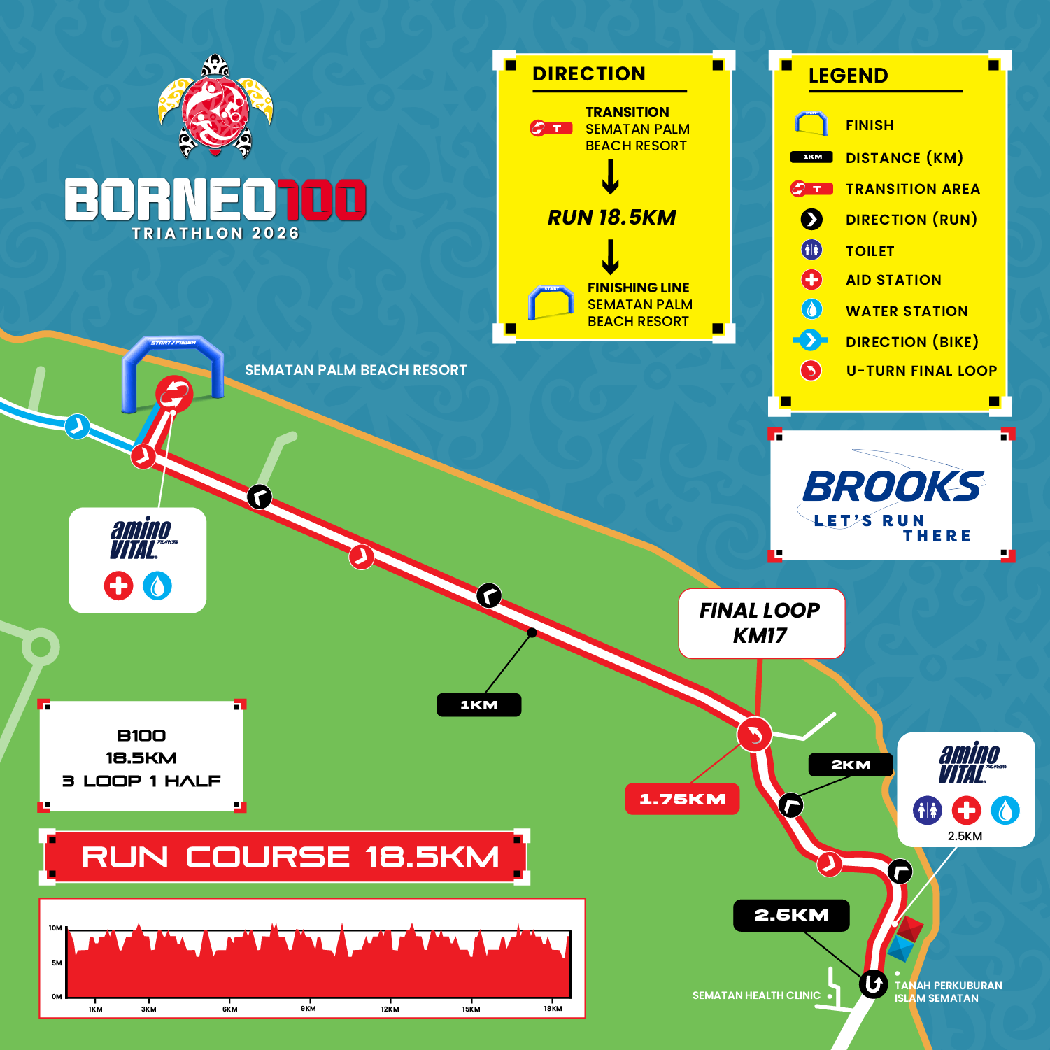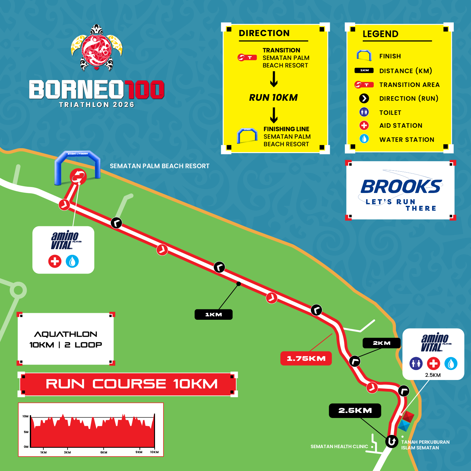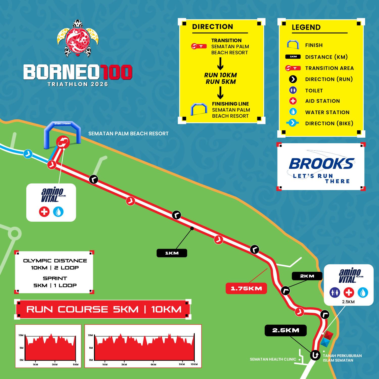 The run will start at Sematan Palm Beach Resort, The Brooks Run Course is designed to be a flat-out coastal speed track. Leading out 2.5KM from Sematan Palm Beach Resort, athletes make their U-Turn return at 2.5KM Mark, making the loop a complete 5KM.
