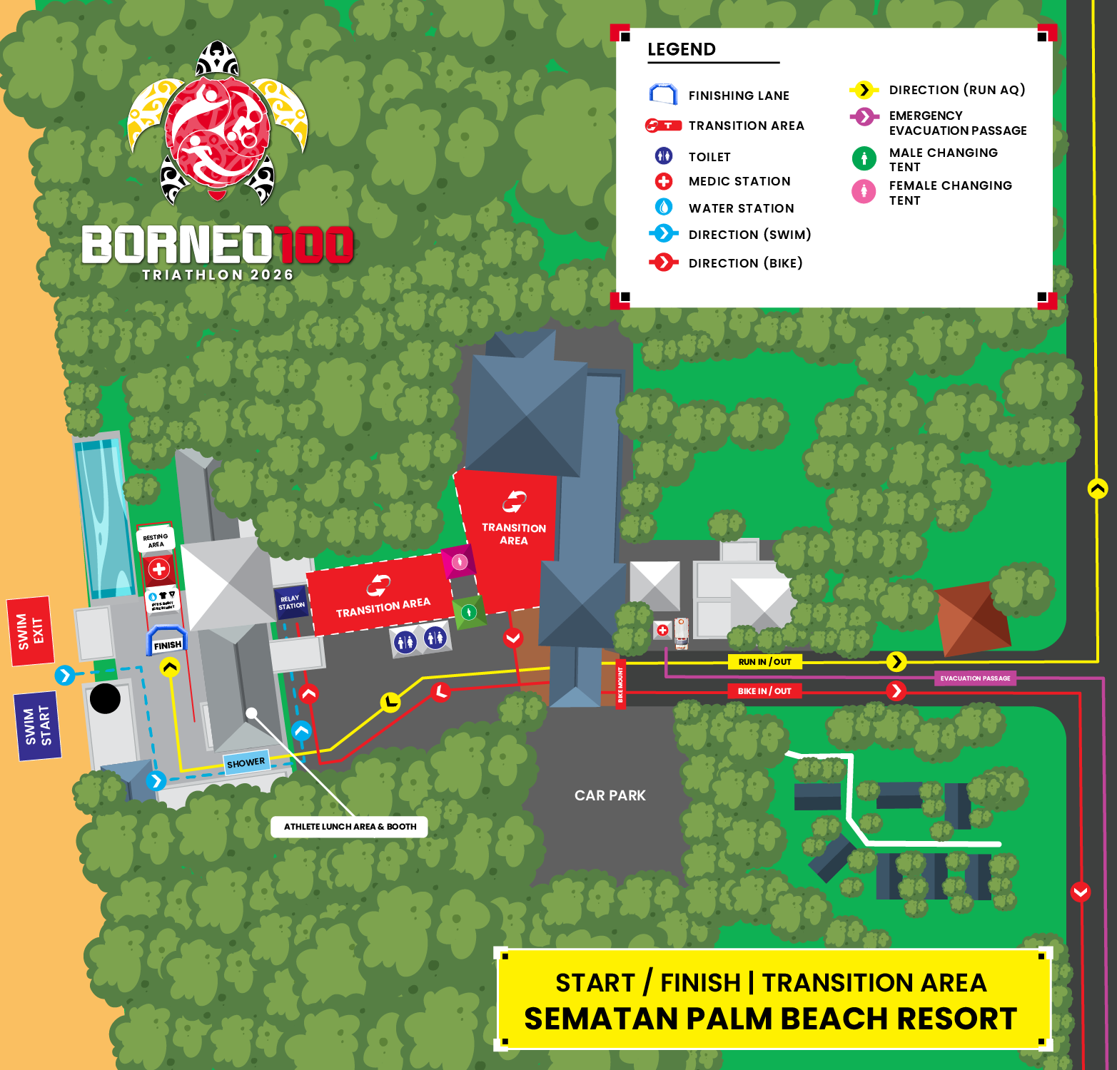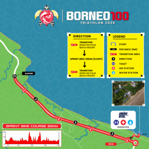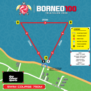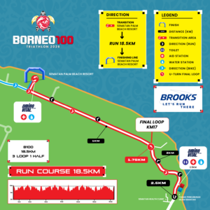 Sprint Athlete do 1 loop, Olympic Distance & Aquathlon athletes do 2 loops, while Borneo100 athlete do 3.5 loops of the Brooks Run Course.