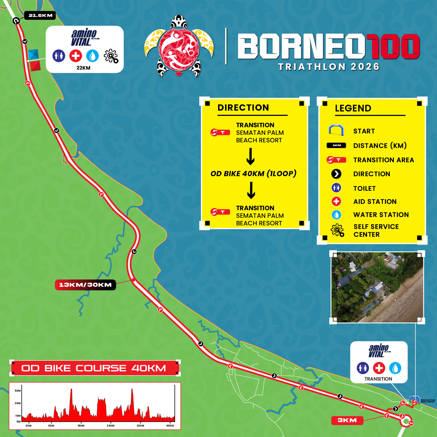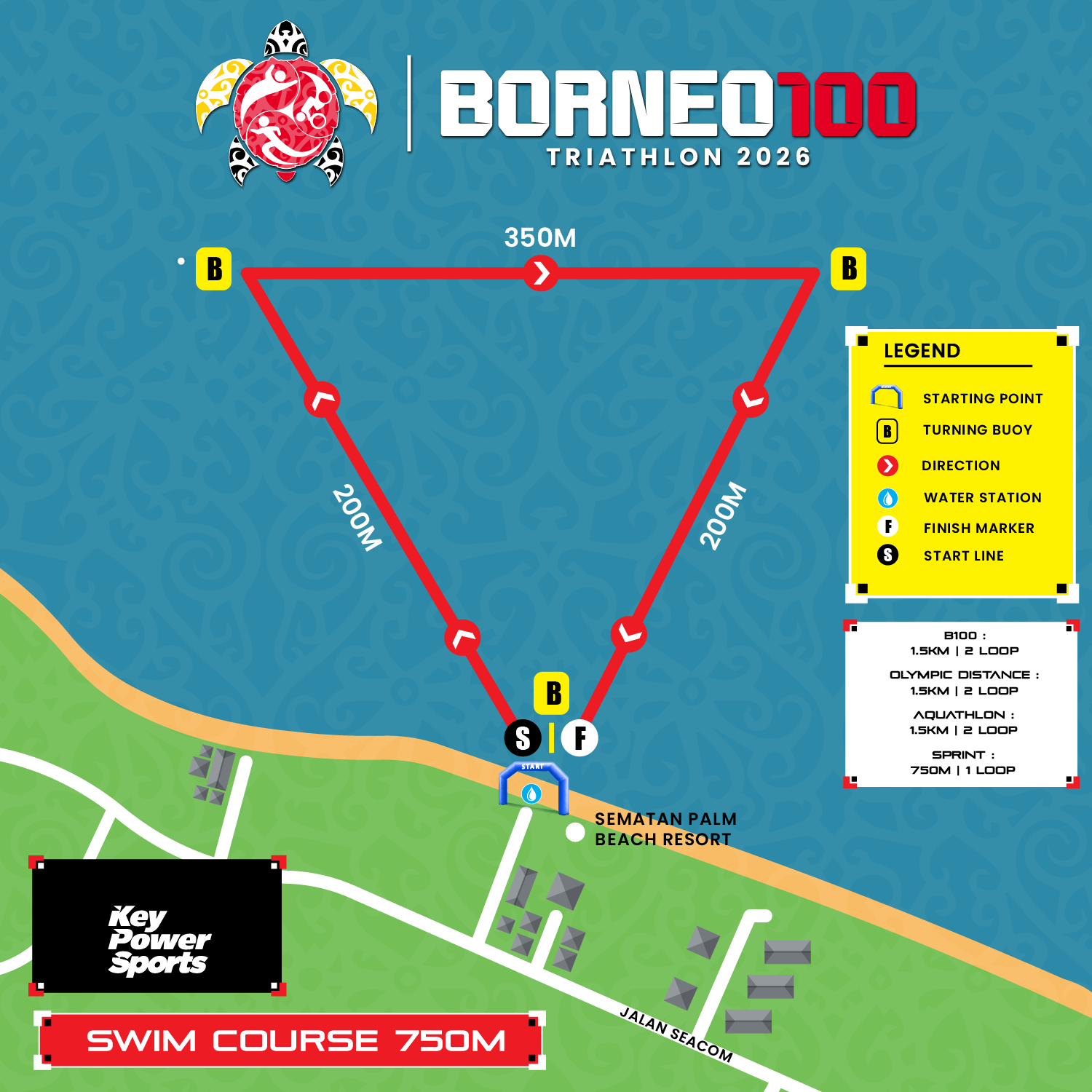 The 40KM loop bike course will head out towards Sematan – Telok Melano, the edge of Borneo. The earliest U-Turn marking/signage at KM11 is only for the Sprint Distance Athlete to make their early U-Turn returning to Sematan Palm Beach Resort for the Transition & Run Start.